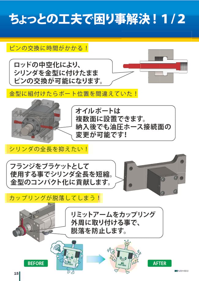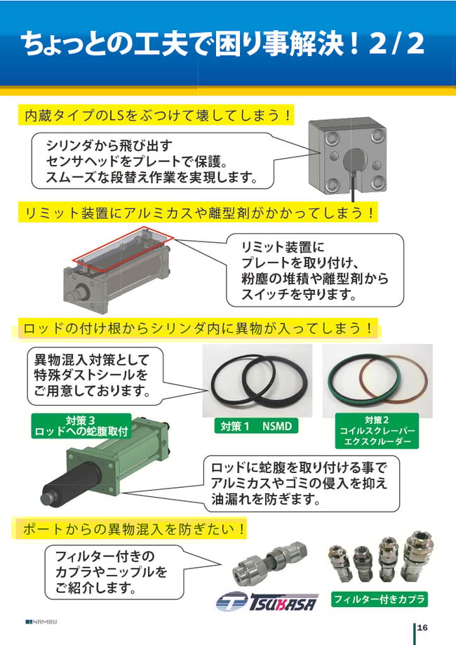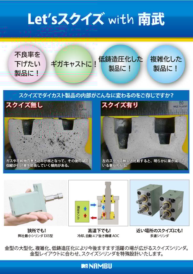 作動油が自動で循環し冷却効果と自動エア抜き機能を備えたAOCシリンダ、鋳巣の発生を防止するスクイズシリンダや少しの工夫でお困りごとを解決できる「このシリンダ ちょっとだけ特殊」コーナーを設置しあらゆるお困りごとに対しソリューションを提案